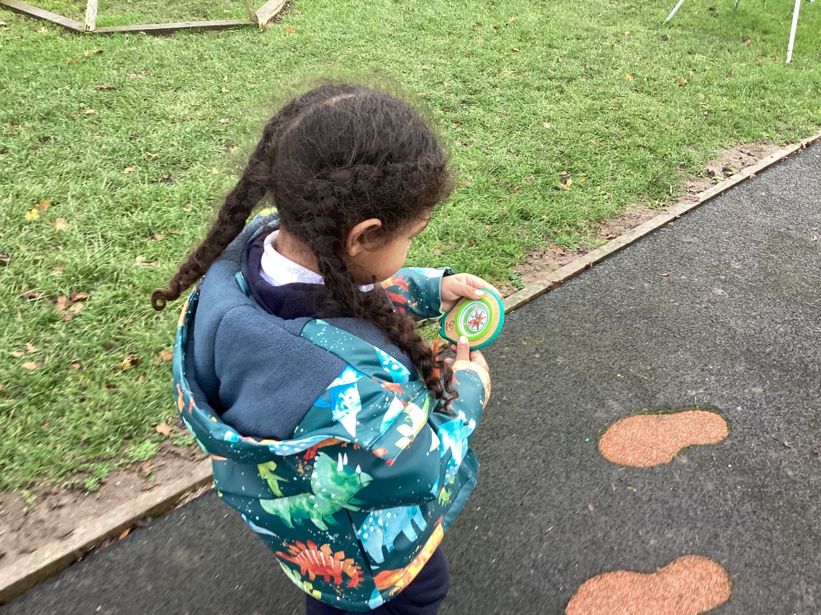 After we went on a real Bear Hunt following our core book of the same name, the children kept initiating going to look for the bear again during freeflow. We added the compass to help us find the bear. The children were using lots of lovely direction words: "It's this way." "Let's head North!"